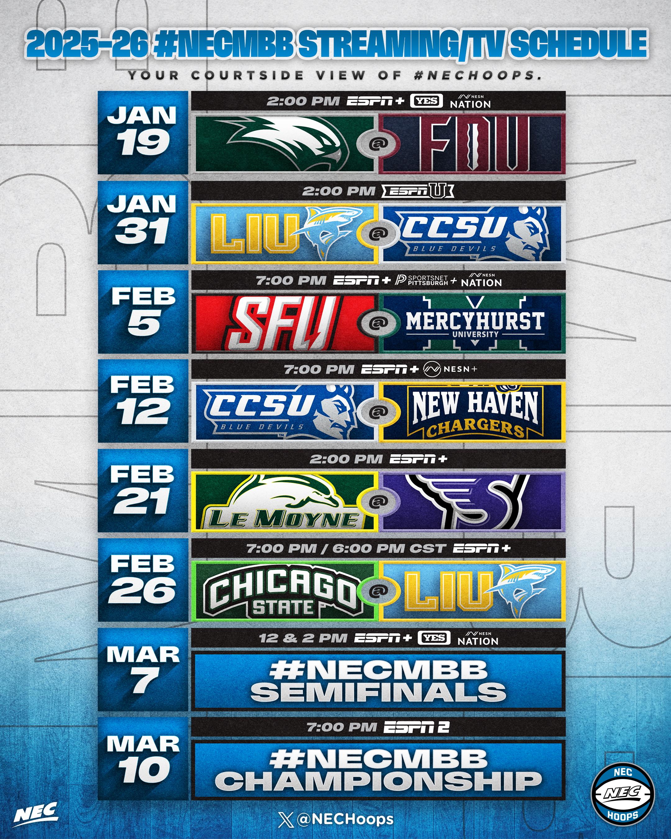 - NEC Tournament coverage includes the men’s and women’s semifinals airing on ESPN+, YES and NESN Nation, with title games on ESPN2 (men) & ESPNU (women).
